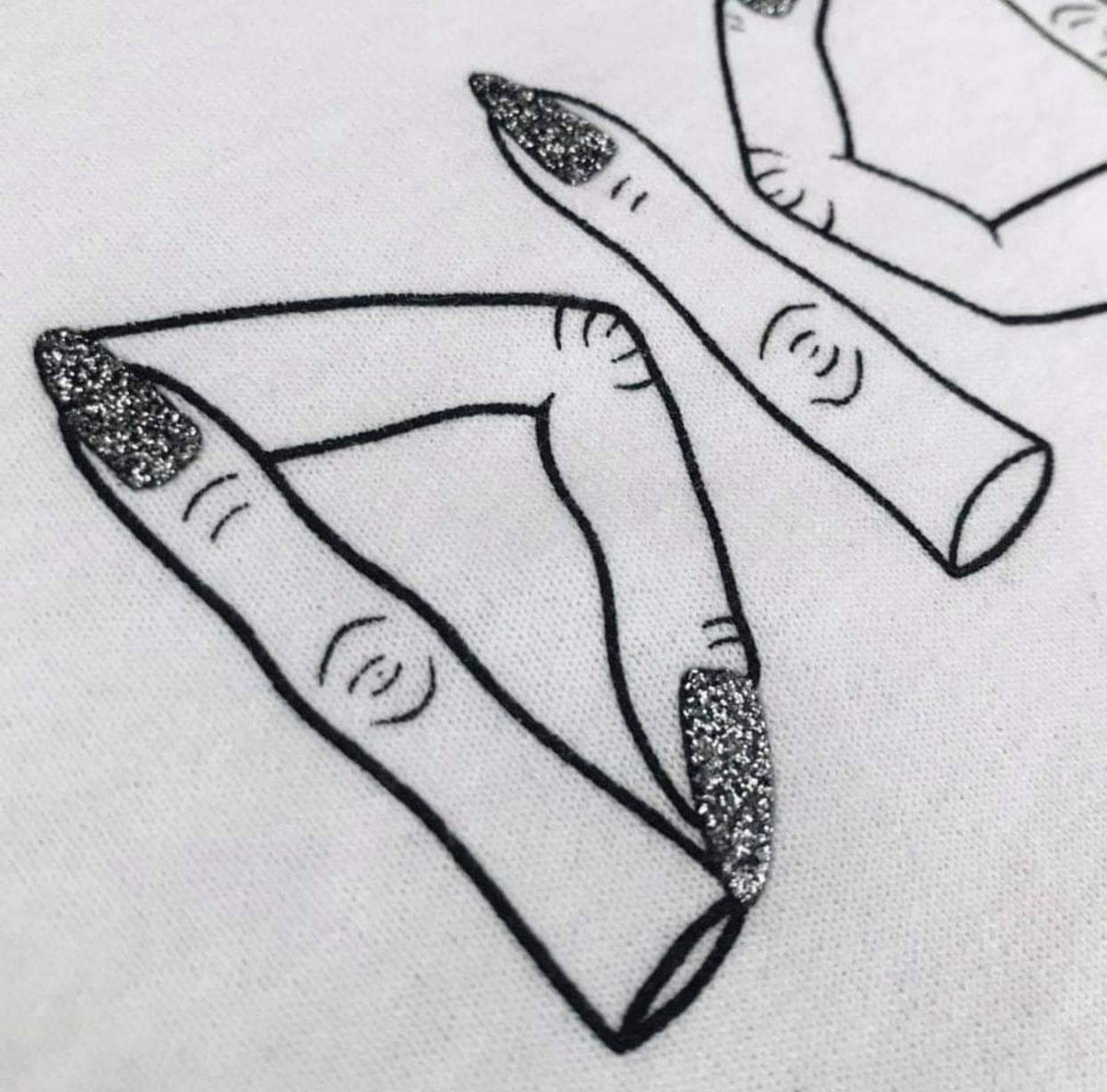 fingered me f*cking weird finger logo with glitter nails, printed on GILDAN Ringer tees. Black print on white.